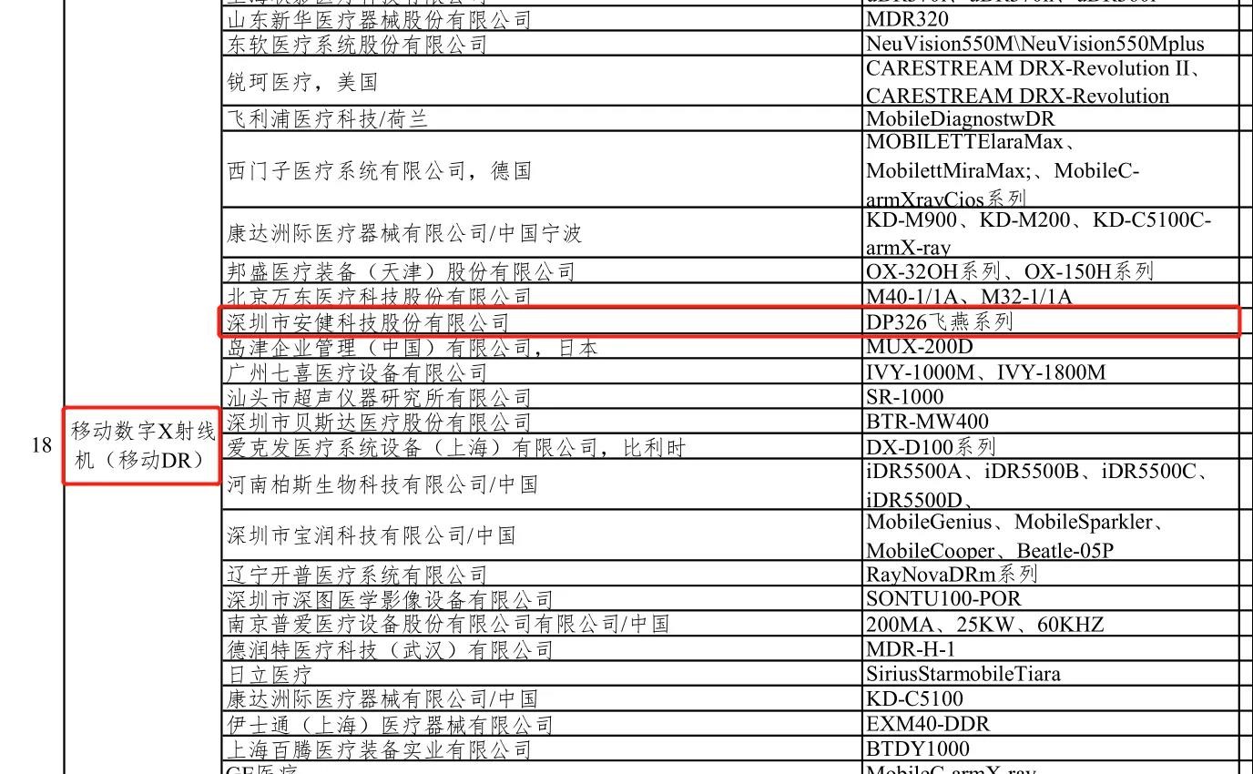 為全力配合國家衛生健康委疫情防治工作需要,2月20日,中國醫學裝備協會發布《新冠肺炎疫情防治急需醫學裝備目錄(第一批,第二批)》。該目錄由行業專家共同研究擬定,供各地疫情防治有關單位決策參考,以有效支援一線醫務人員,全力抗擊新冠肺炎感染疫情。安健科技包括DTP57X騰靈動態平板DR系列、DTP580動態平板DR系列、DP326飛燕移動平板DR系列、MTP50/65系列、DR50X系列在內的多款設備入選該目錄。