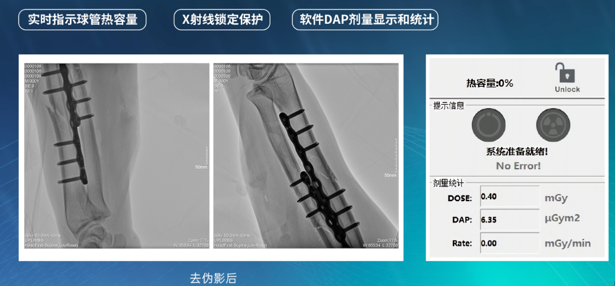 不僅如此,悅畫在產品的劑量安全管理上,還支持DAP劑量實時顯示與統計功能。為了減少誤操作的X射線曝光,悅畫具有X射線鎖定保護功能,在攝影曝光停止后立即進行X射線曝光鎖定,解鎖后才能支持繼續曝光,減少以往臨床過程中醫務工作者因為誤操作所導致的額外X射線輻射。