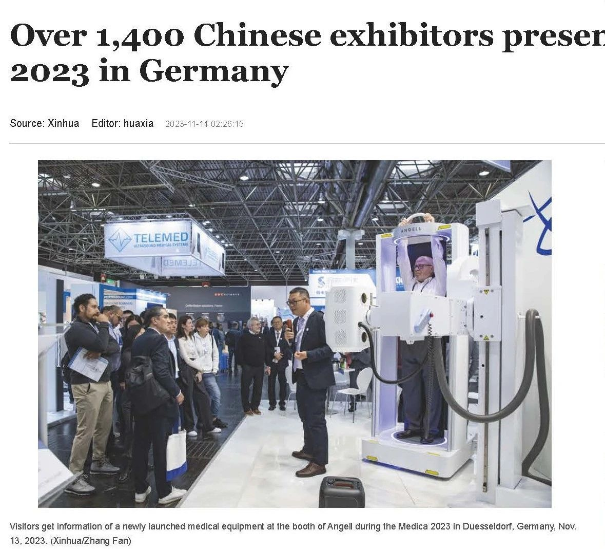 安健科技WR-3D立位錐束CT創新解決方案得到了全場關注,吸引了全球幾十個國家和地區的醫療專業人員的關注,并得到了新華社海外2023年MEDICA專題報道封面報道。