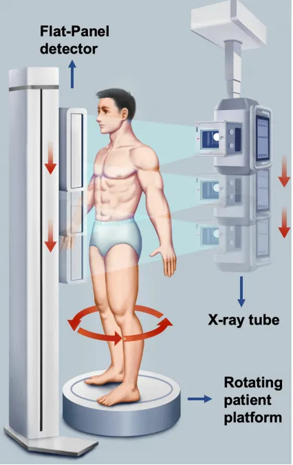 WR-3D立位錐束斷層容積成像系統采用Cone-Beam錐束成像技術。通過旋轉站臺帶動患者低速旋轉,從不同角度捕獲透視圖像并重建出患者掃描部位的三維容積圖像。錐束成像技術擁有更大的錐角及更大的Z軸覆蓋范圍,實現全脊柱區域完全覆蓋。