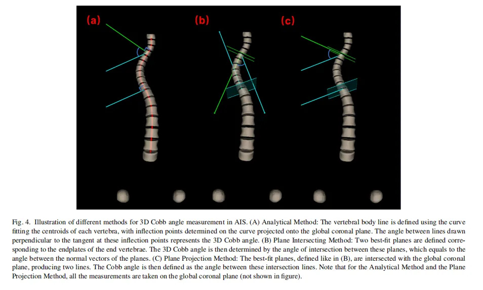 Analytical method(AM):椎體線被定義為最適合每個椎骨的質心(幾何中心)的曲線。這些質心投影到全局冠狀平面上(由連接股骨頭和Z軸的線定義)。WR-3D系統將自動將曲線的拐點(凹度發生變化的地方)識別為測量點,然后在這些拐點處垂直于切線繪制直線,這些垂直線之間的角度為三維Cobb角(下圖a)。