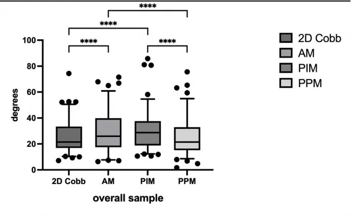 本次研究共招募了53名AIS患者,包括88條脊柱曲線,分別進行傳統二維Cobb測量與立位三維Cobb角測量。二維Cobb角測量由經驗豐富的醫生手動測量;三維Cobb角測量則通過WR-3D技術,采用Analytical method (AM)、Plane intersecting method (PIM)、Plane projection method (PPM)三種不同的測量方法。