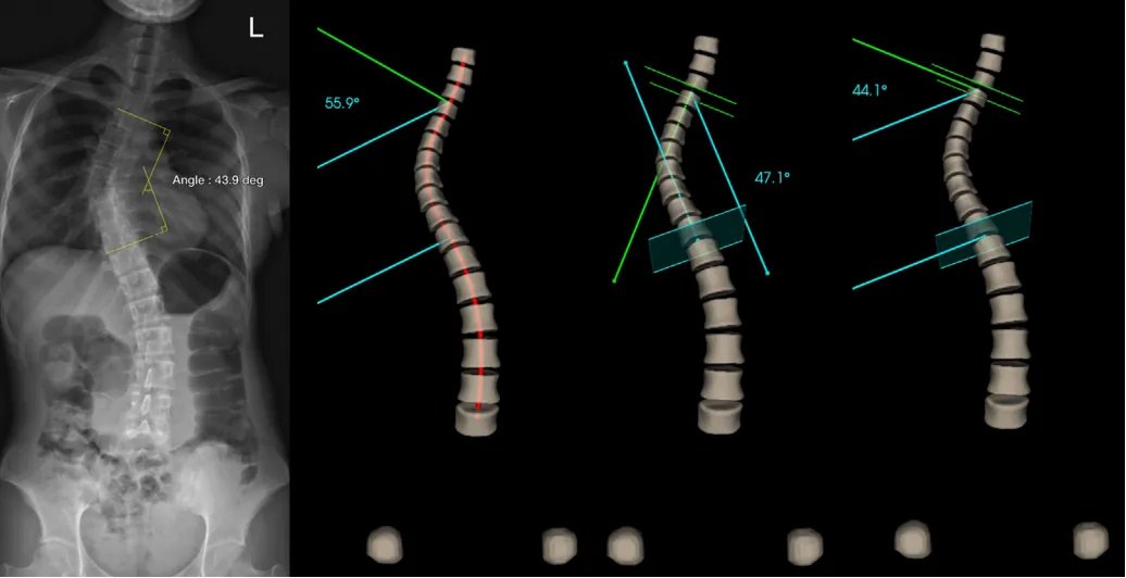 AIS需要準確的脊柱曲度評估才能進行有效的臨床治療。目前Cobb角測量是量化脊柱彎曲和脊柱側彎嚴重程度的關鍵評估手段。傳統的影像學檢查一直采用的是二維Cobb角測量,雖然這種方法為初始診斷和監測疾病進展提供了一個依據,但因二維影像的限制,容易受到組織覆蓋,X線投射角度變化,不同醫生測量習慣不一樣等原因,使測量值產生差異及診斷不一致。