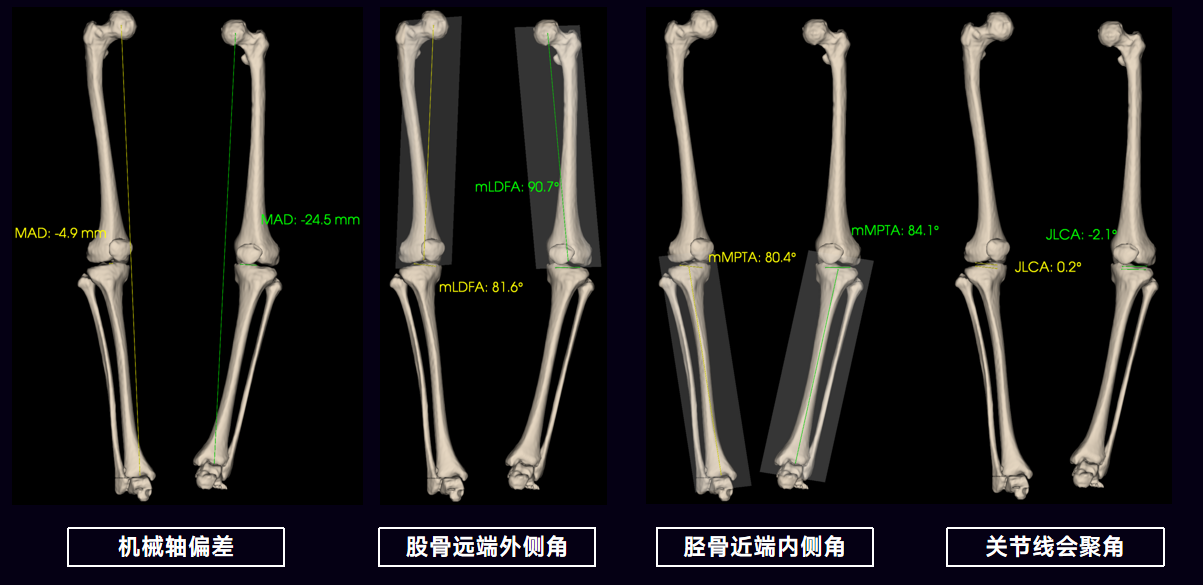 與此同時,WR-3D技術搭載的AI自動測量系統在膝關節診療中能夠完成關節線會聚角、膝關節間隙、髁間窩寬度/高度等參數的自動測量,并能提供股骨遠端外側角、脛骨近端內側角、關節線會聚角、機械軸偏差等參數。為醫生提供更加全面的骨骼信息,為患者保守治療和手術治療提供了精準的數據支撐,有效補位CT和MR。